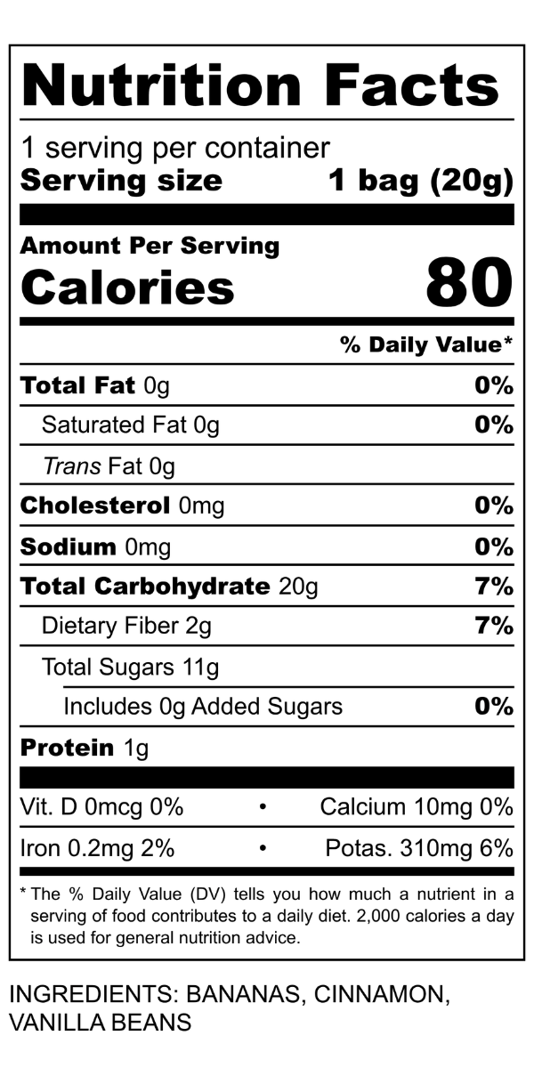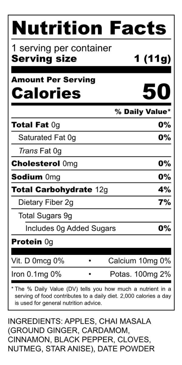 Apples, Chai Masala (Ginger, Cardamon, Cinnamon, Black Pepper, Cloves, Nutmeg, Star Anise, Date Powder, Lemon Juice to Prevent Browning, Pineapple, Dried Coconut, Banana, Cinnamon, Vanilla Bean