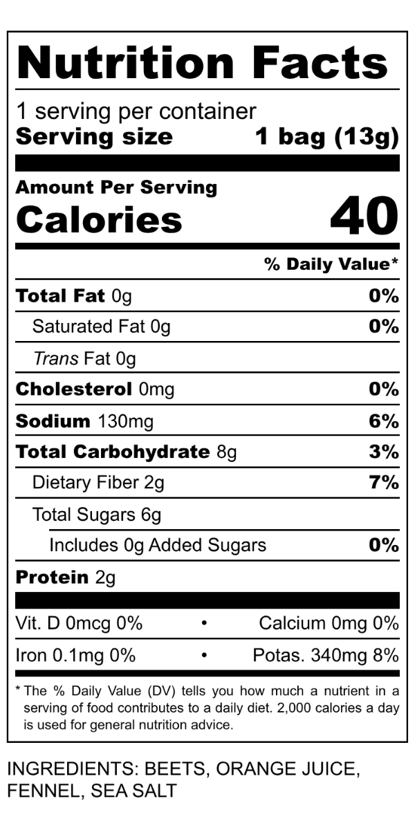 Earthy, citrusy, and a little unexpected. Sweet roasted beets meet the subtle notes of fennel, bright orange, and a pinch of sea salt in this freeze-dried bite that’s equal parts refreshing and satisfying. It’s a flavor-forward twist on veggies—perfect for snack breaks, lunchboxes, or straight from the bag when you need something bold and a little bit fancy.